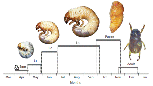 Rodrigues, Puker and Tiago (2010) reported that the life cycle of L. dorsalis was completed in 273.5 days, which characterizes this species as univoltine. Adults of L. alvarengai (Frey 1976) and L. aff. semipruinosus (Ohaus 1917) emerge at the start of the rainy season, when they mate and reproduce. The immature stages complete the life cycle in less than a year (Pereira, Rodrigues, & Morón, 2013).