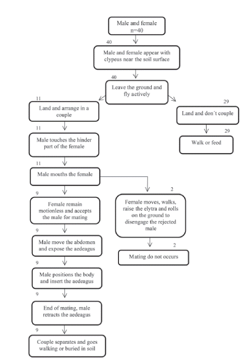 In the laboratory, we initiated the observations of mating behaviors as adults of L. albopilosus flew off. Couples were formed and carefully sampled in plastic recipients (1 L capacity) with 1/3 of its volume filled with soil to observe the mating behavior. We observed the behavior of 40 couples of L. albopilosus during the experimental period.