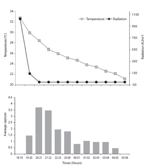 Regarding flight time in the field, adults were collected with a light trap from 19:00 to 5:00 hours on the following day (Fig. 3). At 18:00 hours, solar radiation was 1 072.02 KJ/m², and decreased to 145.072 KJ/m² until 19:00 hours. Afterward, adults initiated flight activities (Fig. 4). From 20:00 to 22:00 hours we obtained the highest average numbers of adults of L. albopilosus, differing statistically from the average number of adults collected in other periods. The average temperature varied between 33 to 21 °C during the flight time of adults in the field (Fig. 4).