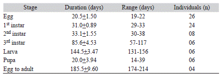 The egg-to-adult period of L. albopilosus (185.5 days) fell within the range values reported for other species of Leucothyreus in the region. Development of L. dorsalis was determined at 273.5 days (Rodrigues et al., 2010). The egg-to-adult period for Leucothyreus alvarengai and L. aff. semipruinosus, was shorter than one year (Pereira et al., 2013) and 170.4 days for L. femoratus (Martínez & Plata-Rueda, 2013), characterizing them as univoltine species.
