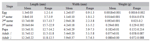 The first instar lasted 31.0 days between April and May, the average size was 3.8 mm long x 1.1 mm wide at thorax with 0.014 g weight. The mean cephalic capsule width was 1.32 mm. The second instar occurred in late May and lasted until early July, totaling 33.1 days. The average size was 13.7 mm length x 2.9 mm thorax width and 0.092 g weight. The mean cephalic capsule width was 2.13 mm (Table 1 and Table 2) (Fig. 2). The third instar larva lasted 85.6 days between July and October and the average size was 20.0 mm length x 4.2 mm thorax width with 0.29 g weight. The mean cephalic capsule width was 3.14 mm (Table 1 and Table 2) (Fig. 2).
