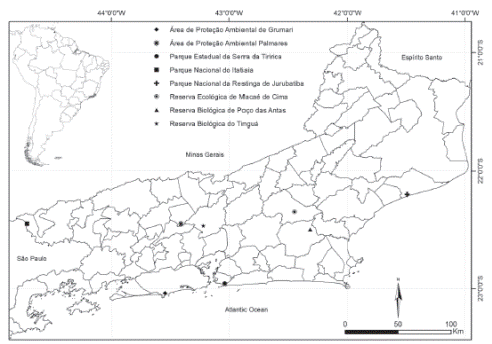 Although the Atlantic Forest presents great biological complexity and high richness and endemism levels, it is one of the most threatened phytogeographic domain on the planet (Davis et al., 1986; Mittermeier et al., 2004). It was reduced to ca. 11 % of its original coverage, and presents predominantly small fragments - smaller than 100 ha (Stehmann et al., 2009). The Atlantic Forest areas in the state of Rio de Janeiro have also been continuously reduced, mainly due to the growth of cities (Peixoto, Martins, Silva, & Silva, 2004). However, there are still large continuous vegetation areas with high connectivity degree in the state (Rocha, Bergallo, Alves, & van Sluys, 2003). These forest areas are predominantly located in the Montane and High-Montane formations of Rio de Janeiro (above 500 m) and almost 50 % of these forests are protected by Conservation Units (Fundação SOS Mata Atlântica / INPE, 2014).