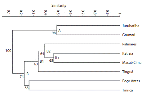 The analysis showed low floristic similarity among the eight areas concerning the Rubiaceae species (Fig. 2). The dendrogram showed the formation of two groups. Group A consisted of APA Grumari and PARNA Jurubatiba, it presented similarity of 0.48 and strong bootstrap support (98 %). Group B included APA Palmares, PARNA Itatiaia, PESET, RE Macaé de Cima, REBIO Poço das Antas and REBIO Tinguá, with 74 % bootstrap support. Inside this large group, we identified three subgroups with moderate support (63-65 %) (Fig. 2). APA Palmares, PARNA Itatiaia, RE Macaé de Cima and REBIO Tinguá formed the subgroup B1, the first three areas formed the subgroup B2, whereas PARNA Itatiaia and RE Macaé de Cima showed the highest similarity (0.46) in group B, and formed the subgroup B3. By contrast, Poço das Antas and PESET presented weak bootstrap support (38 %) (Fig. 2).