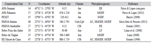 Similarities in the composition of Rubiaceae species was evaluated according to surveys conducted in eight Atlantic Forest areas in the State of Rio de Janeiro, Brazil - Área de Proteção Ambiental de Grumari (APA Grumari), Área de Proteção Ambiental Palmares (APA Palmares), Parque Estadual da Serra da Tiririca (PESET), Parque Nacional do Itatiaia (PARNA Itatiaia), Parque Nacional de Jurubatiba (PARNA Jurubatiba), Reserva Biológica de Poço das Antas (REBIO Poço das Antas), Reserva Biológica do Tinguá (REBIO Tinguá) and Reserva Ecológica de Macaé de Cima (RE Macaé de Cima) (Gomes, 1996, 2001; Barros, 2008; Lima, 2008; Lima et al., 2008; SilvaNeto & Peixoto, 2012; Paiva & Lopes, 2013; Paiva, & Lopes, 2015 pers. comm.; Fig. 1). The main physiographic features of these areas are listed in Table 1. The phytogeographic area classification followed Fiaschi and Pirani (2009); the vegetation types were according to Veloso, Rangel Filho and Lima (1991) and the weather was classified as per Koëppen’s classification (1948).