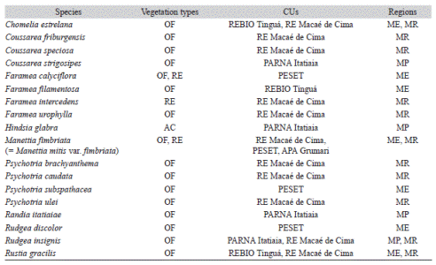 Information concerning the geographical distribution of Rubiaceae species followed that by Barbosa et al. (2014, 2015), and microendemic species from the Atlantic Forest were marked in the present study. The conservation status for those species was obtained in Zappi et al. (2013). CRIA database (2015) was consulted to provide the number of specimens per species deposited in the herbaria by species. Rio de Janeiro regional division was found in CEPERJ (2015).