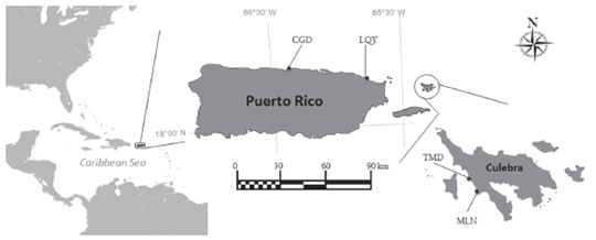 Study site and data collection: Surveys were conducted in October of 2013 at four reef crests of the Puerto Rico Archipelago. Two sites were located on the Northeastern coast of Puerto Rico, with the other two located off the island of Culebra (Fig. 1). Sites were Cerro Gordo (CGD: 18°16’51.40” N - 65°17’12.21” W), Luquillo (LQY: 18°23’18.46” N - 65°43’5.52” W), Tamarindo Bay (TMD: 18°18’55.29” N - 65°19’5.82” W), and Melones (MLN: 18°18’15.70” N - 65°18’42.27” W). All sites are shallow-water fringing reefs between 1-2m in depth. Culebra Island has no rivers, precipitation average is low, and volcanic and intrusive rocks, with some limestone deposits (U.S.G.S., 1996), characterize the substrate. The sites CGD and LQY are composed of carbonate rocks (Rodríguez-Barreras, Pérez, Williams, Mercado-Molina, & Sabat, 2014).