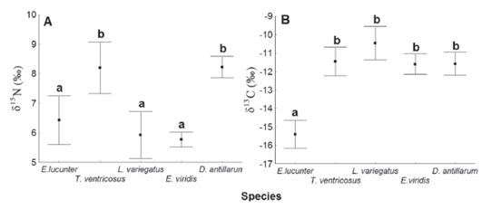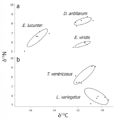 Biological processes responsible for carbon and nitrogen movement in and out the ocean are critical in determining the natural abundance of these two elements in marine ecosystems (Nixon et al., 1996). However, there is a high degree of spatial variability in coastal marine systems, mainly in nearshore and continental shelf waters due to biotic and abiotic factors (van Dover, Grassle, Fry, Garrit, & Starczak, 1992). Analysis of trophic relationships using stable isotopes is usually more complex, as primary producers and consumers are part of a complex trophic system in which changes in primary producers affect the isotopic signatures of herbivores (Fry & Sherr, 1984; Peterson, Howarth, & Garritt, 1985). For this reason, stable isotope studies have become a fundamental tool for assessing trophic niche interactions (DeNiro & Epstein, 1981; Caut, Angulo, & Courchhamp, 2008; Parnell, Inger, Bearhop, & Jackson 2010; Boecklen, Yarnes, Cook, & James, 2011, Rodríguez-Barreras, Cuevas, Cabanillas-Terán, & Sabat, 2015).