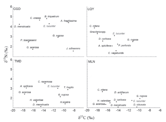 There is often a high degree of spatial variability in shallow-water ecosystems. Both nitrogen and carbon elemental concentrations may vary due to abiotic and biotic factors, including atmospheric deposition, volatilization, microbial processing, terrestrial runoff, etc. (van-Dover et al., 1992; Nixon et al., 1996). Anthropogenic enrichment may alter marine benthic food webs, increasing the ratios of heavy isotopes in primary producers (McGlathery, 2001; Tewfik, Rasmussen, & McCann, 2005). In fact, the presence of elevated values of δ15N has been shown to be related with local NO3 enrichment (Clark & Wilcock, 2000; Cloern, 2001). In general, our seaweed communities exhibited no spatial differences in nitrogen, which indicates a relative homogeneity in δ15N among sites. This is probably due to their geographical proximity. In contrast, spatial differences among seaweed communities in terms of δ13C might be related to community composition, metabolic species-specific characteristics, or to local geomorphologic features. The CGD site exhibited differences with respect to the other three sites. This difference may be linked to the existence of a mangrove lagoon canal located approximately 200 m away. This is important because mangrove systems provide nutrient inputs, mainly carbon, to nearshore waters (Zieman, Macko, & Mills, 1984; Rezende, Lacerda, Ovall, Silva & Martinelli, 1990).