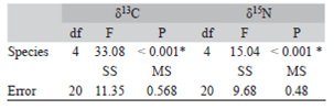The δ15N signal for the five studied echinoids of hardground biotopes varied from 5.77 ± 0.25 &#091;mean ± SD&#093; to 8.22 ± 0.36 ‰; whereas the species collected on seagrass biotopes showed values of nitrogen from 6.09 ± 0.79 to 8.02 ± 0.36 ‰ (Fig. 2A). The species T. ventricosus and D. antillarum showed the highest values of δ15N. Sea urchins exhibited similar values of δ13C varying from -11.6 ± 0.63 to -10.4 ± 0.99 ‰. The echinoid E. lucunter displayed the lowest values of carbon, from -15.40 ± 0.76 ‰ (Fig. 2B). Significant differences among species were found for δ15N and δ13C (Table 1). A posteriori analysis displayed differences in δ15N between the group formed by E. lucunter, E. viridis and L. variegatus and the upper group formed by D. antillarum and T. ventricosus (p< 0.001, Fig 2A). Whereas differences in terms of δ13C were found in E. lucunter with respect to the other four species (p< 0.001, Fig 2B). We found no differences in δ15N signal of E. lucunter among sites, but we did find spatial differences in δ13C (F= 7.410, df= 3, p= 0.001). Those spatial differences were between the sites CGD and TMD (p= 0.001), and between CGD and LQY (p= 0.020).