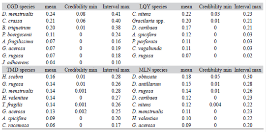 The ellipse-based metrics of niche width analysis -restricted to one locality- found that the hardground biotope species (D. antillarum, E. lucunter, and E. viridis) did not overlap each other (Fig 4A). Similar results were obtained for the co-occurring species of the seagrass biotope; however, the distance between these species was closer than that of the hardground biotope species (Fig 4B). The Bayesian mixing models run for E. lucunter at all four localities found differences in food resources contribution. For instance, the algae D. menstrualis, C. crassa and B. triquetrum dominated in CGD; whereas C. nitens, Gracilaria spp., and D. caribaea represented the main algae species to the diet of E. lucunter at LQY (Table 2). In Culebra Island, no dominance of any particular algae was detected in TMD, where six of the eight species exhibited a similar contribution (Table 2). Although MLN displayed a similar low dominance of species as that of TMD, two algae remained with a mean contribution over 15 %: Dichotomaria obtusata and Dasya antillarum.