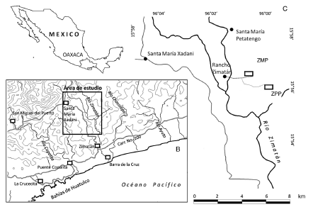 Área de estudio: El estudio se desarrolló en el Municipio de San Miguel del Puerto, en la Planicie costera del Pacífico, Oaxaca, México (Fig. 1).