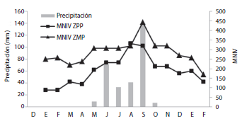 En la ZMP se presentaron índices de trampeo superiores a 80 % en seis periodos; durante la temporada seca de 2005 se registró el valor más alto (86 %, Cuadro 3).