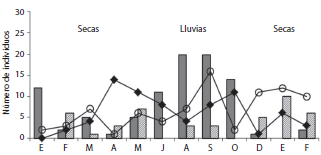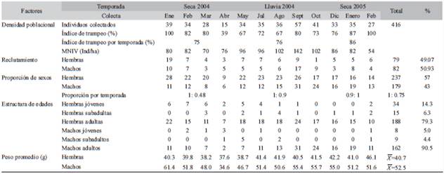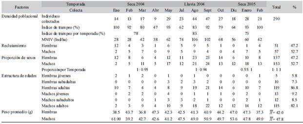 En ambas zonas la mayoría de los individuos fueron adultos (> 70%) (Cuadro 2 y 3). En la ZPP, la mayoría de hembras fueron adultas (n = 119; 86.8 %) (ANOVA de dos vías, F(2,33) = 31.41, P < 0.001). El pico se observó durante la temporada de lluvia (septiembre, 21 ind.) y los valores más bajos durante la temporada seca 2004 (marzo, 4 ind.) (Cuadro 2). En los machos, la mayoría fueron adultos (n = 115; 82.1 %) (ANOVA, F(2,33) = 28.72, P < 0.001). El valor máximo se presentó durante la temporada de lluvia (septiembre, 22 ind.) y el mínimo durante la seca (enero 2004; 2 ind.) (Cuadro 2).