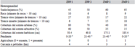 Factores de perturbación: El sitio 1 registró menor perturbación, por lo que se le denominó “zona poco perturbada” (ZPP); se registró mayor cobertura arbórea y arbustiva, se encuentra más alejado a poblados y menor presencia de ganado. La mayor perturbación se registró en el sitio 2, se le denominó “zona más perturbada” (ZMP); presenta mayor cantidad de troncos muertos, menor cobertura arbórea y mayor cobertura herbácea; además, a menos de 100 m se encontraban zonas de cultivo (Cuadro 1).