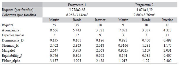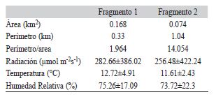 Los dos fragmentos presentan diferencias en el tamaño, la relación perímetro/área y las condiciones ambientales (Cuadro 2).