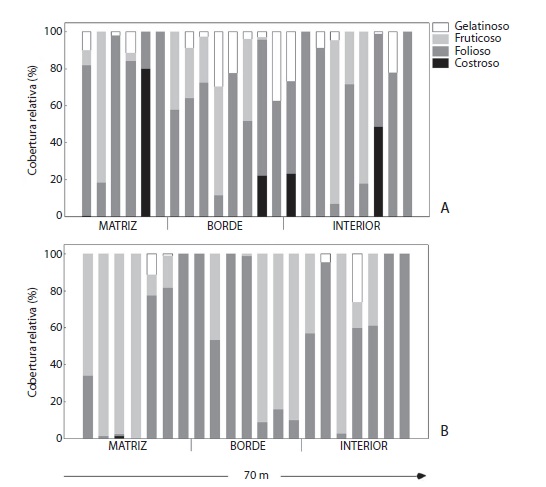 Con relación a la forma de crecimiento del talo en el fragmento 1 los líquenes foliosos presentan una cobertura dominante sobre los demás y una amplia distribución sin que haya ningún tipo de preferencia por alguna zona del gradiente; el tipo gelatinoso mostró cierta tendencia a aumentar su cobertura hacia el borde; los líquenes de tipo costroso estuvieron presentes en menor cobertura en la zona de borde. En general, fue notoria una mayor cobertura de los líquenes fruticosos en matriz y en la transición borde-interior. Las coberturas de los líquenes gelatinosos al igual que de los costrosos fue muy baja en comparación a los demás tipos de talo del mismo fragmento (Fig. 2).