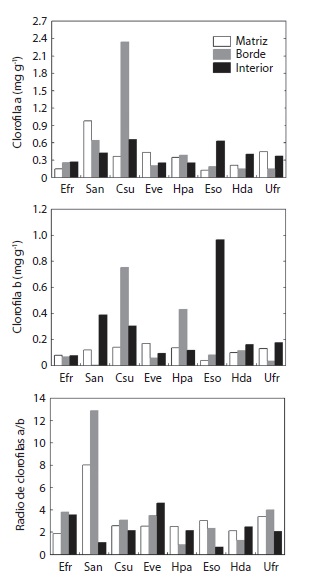 La concentración de clorofilas de especies generalistas mostró patrones asociados al gradiente matriz-borde-interior. Everniastrum fragile presenta un menor contenido de clorofila a (0.15 mg / g) en la matriz; Usnea fragilensis reduce la concentración de clorofilas en el borde. En Everniastrum vexans la clorofila a y b se encuentran en mayor concentración en la matriz. Sticta andina presentó su máximo valor del radio de clorofilas a/b en el borde y el mínimo hacia el interior, y Cladonia subradiata tuvo un mayor contenido de clorofilas hacia el borde. Everniastrum sorocheilum mostró un aumento de las clorofilas a y b desde la matriz hacia el interior (Fig. 4).