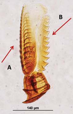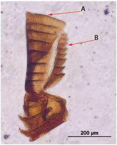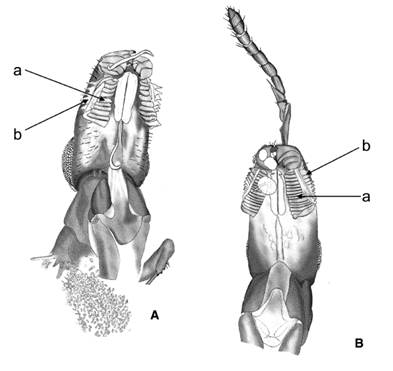 Syconia of F. crassiuscula Standl. were collected in Santa Cruz, Turrialba, Costa Rica (09°58´02” N - 83°44´15” W, at 1 430 m of elevation), from F. macbridei Standl. in Tapantí National Park, Costa Rica (09°46´13.2” N - 83°47´59” W, at 1 239 m in elevation) and of F. crassivenosa W. Burger, from near Quebrada Cataratitas, San Ramón, Alajuela, Costa Rica (10°14’3.26” N - 84°31’29.39” W, at 755 m in elevation). Naturally colonized syconia of Ficus crassiuscula and of F. macbridei were collected one day before they reached the male phase. Each syconium was individually enclosed in a tightly capped jar. Once the wasps emerged from the syconia, they were put to sleep with acetone and preserved in ethanol 70 % for further identification and dissection. Hexapus females and males were also collected by the author from the syconia of a cauliflorous riparian Pharmacosycea sp. in Jiménez, Biscucuy, Portuguesa State, Venezuela in 1966. The pollinators of F. petenensis Lundell was collected from Veracruz, Mexico, and described as Hexapus ramirezi by (Xochitl M. Cuevas-Figueroa, 2009, unpublished). A female of H. ramirezi was obtained from a preserved syconium of F. petenensis Lundell (=F. apollinaris Dugand); voucher number 2502 deposited at INBio Herbarium, Santo Domingo de Heredia, Costa Rica. The illustrations of two fossil female Hexapus are used with the permission of Enrique Peñalver (2006, Fig. 2a y Fig. 2b). The dissections of the wasps were made with the help of a dissecting microscope while the wasps were submerged in 70 % ethanol in a Syracuse container, the body structures were dislodged by mean of minute Nadel hook and mounted in Hoyer’s fluid to be illustrated. The species of Ficus studied were identified by the author using the descriptions of (Burger, 1977) and (Berg, 2009). The scientific names of the figs were consulted in Tropicos® of the Missouri Botanical Garden and in (Berg, 2009). The term Agaoninae corresponds to the pollinating wasps, sensu (Bouček, 1988) or to Agaonidae sensu (Rasplus, Kerdelhué, Le Clainche and Mondor, 1998). The term Tetrapus refers to Tetrapus (Mayr, 1885), and Hexapus to a Tetrapus group, who’s female have two independent mandibular appendages and hexapodous males, noted as Hexapus subg. nov. in preparation. Since the five morphotypes of Hexapus studied were collected from five defined Ficus spp. and from different geographical areas, they are assumed to be distinct morphotypes until they are definitely described. The mandibles of Nigeriella excavata were also studied.