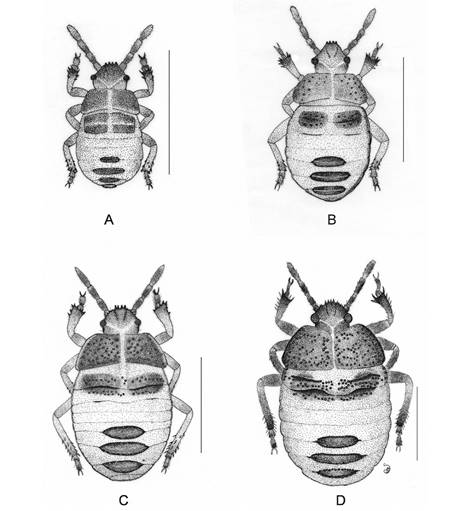 Fourth instar description (Fig. 1D): Oval body, dorsally convex; light browned head wider than longer and with the tylus surpassing the juga; four dark browned spines at the margin of the jugum; pale reddish eyes; pale yellowed rostral segments, reaching the basal part of the metanotum; light browned antennal segments I-III, pale yellowed antennal IV segment; light browned pronotum wider than longer with dark browned deep punctuations at its surface and with the anterolateral light browned margin smooth and carinated; white mesonotum with disperse punctuations at the basal part; wing pads evident; scutellum wider than longer covering slightly the metanotum; light browned anterior legs; paled yellowish middle and third pair of legs; white abdomen with dark browned mesial plates, slightly rectangular.