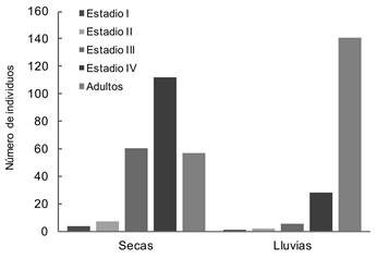 La mayor abundancia de A. rugosus en la época de sequía, se puede explicar debido a que la presencia de lluvias dificulta el movimiento de la especie en el suelo, y además, porque disminuyen los sitios de refugio en especies de hábitos edáficos. La mayor abundancia de individuos tanto de ninfas como adultos, se registró en los meses de abril y mayo, cuando la cantidad de hojas y la producción de semillas en el suelo, son recientes y los sitios de oviposición se vuelven ideales. McColloch y Hayes (1922) mencionan que la distribución, abundancia relativa y actividades estacionales de insectos pueden estar relacionadas con ciertas condiciones del suelo. Observaciones similares fueron registradas por Mayorga y Cervantes (2001) en A. ficus. Así mismo, Tsukamoto y Tojo (1992) mencionan la preferencia de Parastrachia japonensis Scott (Cydnidae) en sitios con mayor hojarasca de árboles huésped, que inicia la caída de las hojas en los meses de abril y mayo; señalando que existe una mayor oviposición y anidación en esa temporada, pues favorece la supervivencia de los individuos.