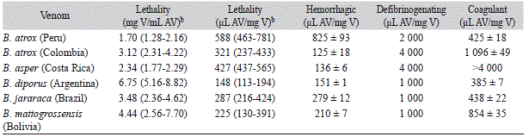 Our results corroborate, for the polyspecific crotaline antivenom produced in Mexico by BIRMEX, the extensive cross-reactivity described for bothropic antivenoms in Latin America (Bogarín et al., 2000; Segura et al., 2010). In this case, when using the venoms of B. asper and C. basiliscus from Mexico in the immunizing mixture, the antivenom generated is effective for the neutralization of the four activities in the venoms of the South American species B. jararaca, B. diporus, B. mattogrossensis and B. atrox (Peru). The neutralization of lethality is the gold standard in the preclinical assessment of antivenom potency; in this regard, it is noteworthy that BIRMEX antivenom has a higher neutralizing ability of lethal effect of the venoms of B. asper (Mexico) (Segura et al., 2012), B. diporus, B. jararaca, B. atrox (Colombia), and B. mattogrossensis than against the venoms of B. asper (Costa Rica) and B. atrox (Peru). In contrast with other bothropic polyspecific antivenoms analyzed in previous works, BIRMEX antivenom has a relatively low neutralizing ability of defibrinogenating activity of the venoms of B. asper from Costa Rica and B. atrox from Colombia, and failed to neutralize in vitro coagulant activity of Costa Rican B. asper venom, at the highest antivenom/venom ratio used in this study (4 000 µL antivenom/mg venom).
