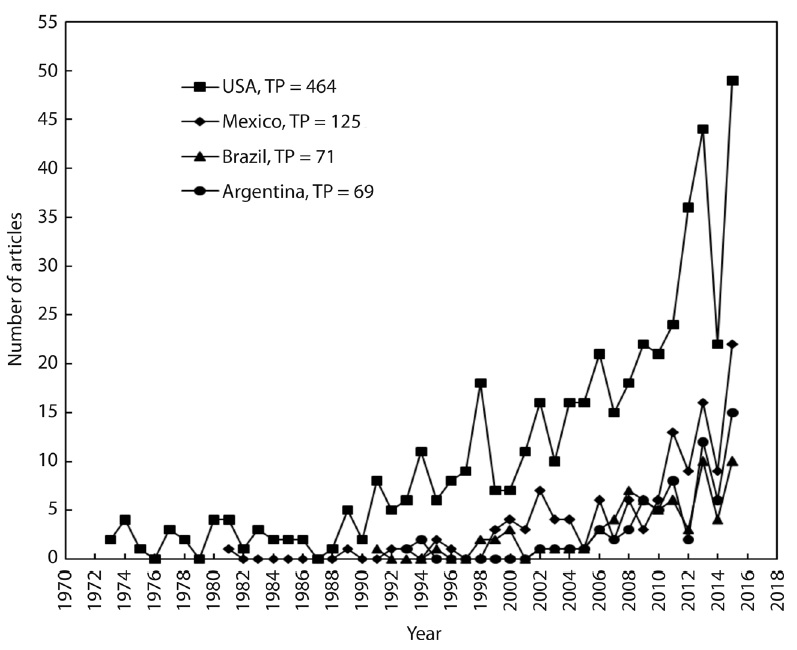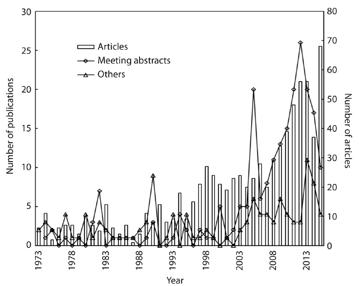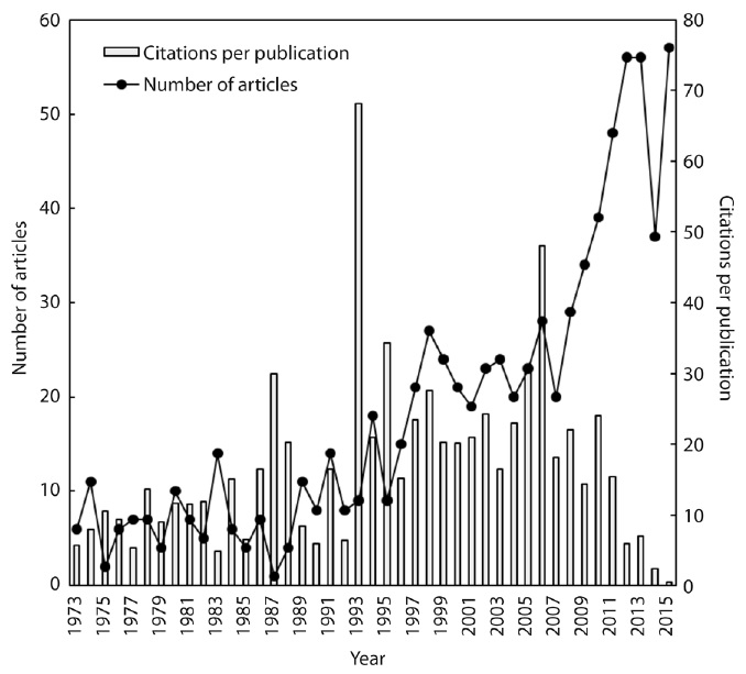 In the period 1973-1995 around seven articles were included in the database every year; this increased to around 20 per year from 1996 to 2007; and there was a clear increase afterwards to reach 68 articles in 2015 (Fig. 1).
