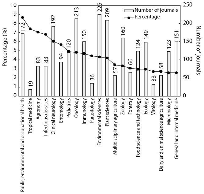 Web of Science subject categories analysis can explain the distribution of research fields in Honduras. Our results are based on the 176 classifications of categories for 2015 in SCI-EXPANDED, and 809 articles published by Honduras scientists with category information in Web of Science, distributed in a wide range of 124 categories. Particularly, public, environmental and occupational health contributed the most of 70 articles (8.7 % of 809 articles), followed by tropical medicine (60 articles; 7.4 %), agronomy (57; 7.0 %), infectious diseases (55; 6.8 %), clinical neurology (49; 6.1 %), entomology (46; 5.7 %), pediatrics (40; 4.9 %), oncology (39; 4.8 %), and immunology (38; 4.7 %). Meanwhile, 71 (88 %) of 124 categories each contributed less than 10 articles, and 29 categories (23 %) each contributed only one article. Figure 2 shows distribution of these categories and a number of journals in the categories.