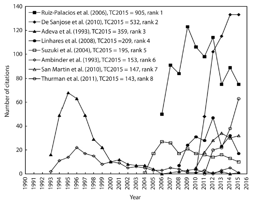 The articles most cited in the database are in the fields of health, including rotavirus vaccines, cervical cancer, epilepsy, Epstein-Barr virus, dengue, breastfeeding, Plasmodium, Helicobacter, mosquito disease vectors, Chagas disease, and diarrhea. Also highly cited are agricultural articles, mainly banana, maize, and bean production; followed by other topics such as climate change, atomic structure, entomology, and ichthyology (Table 5 and Digital Appendix 3).