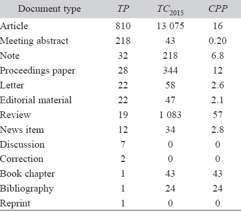 Articles represent the great majority of Honduras publication in the SCIEXPANDED, followed by meeting abstracts. Each of all other kinds of publications such as letters, editorials, reviews, and book chapters do not represent more than 2 % of publications (Table 1).