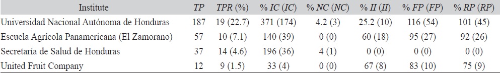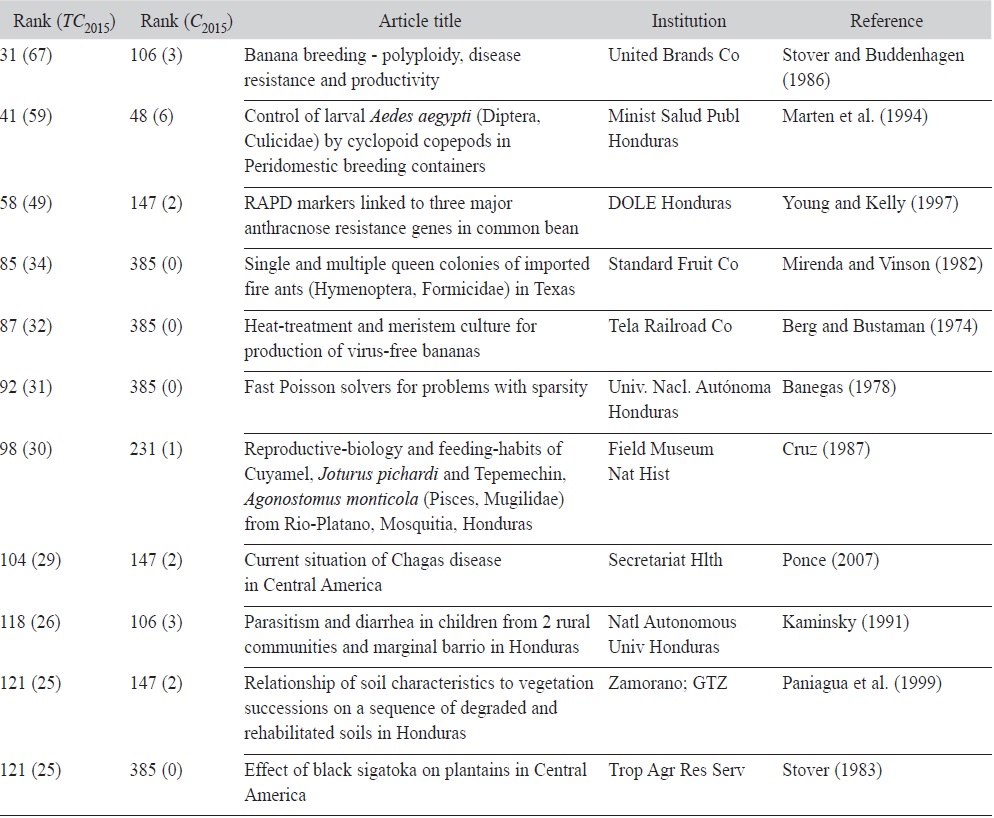 In Honduras, the main producer of scientific articles that reach the database is the Universidad Nacional Autónoma de Honduras, UNAH (Table 3). The UNAH, founded in 1847, is the largest public university in the country and is active in all the typical areas of Latin American universities such as humanities and pure and applied sciences. The most productive research department in that university is the Tegucigalpa Hospital School, which publishes medical research. The second producer is the Pan American Agricultural School (“El Zamorano”), founded in 1942 to educate staff for the United Fruit Company, but now it is an independent school. The third producer is the Ministry of Health, also known as Secretaría de Salud, founded in 1900 and currently in charge of the coordination and execution of all health related projects of the Honduras government. Finally, the now merged United Fruit Company (founded in 1899) had a research division that produced an important number of articles included in the database (Table 3).