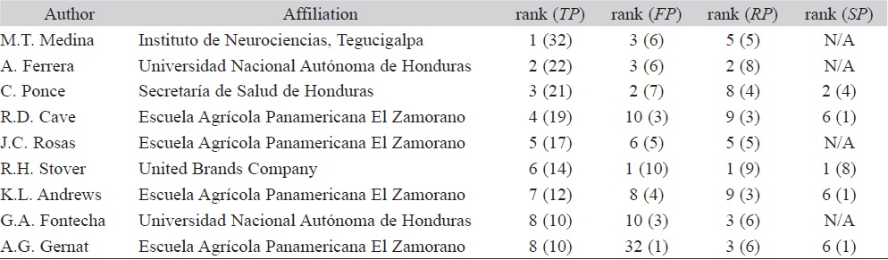 The top productive authors in the database are Honduras researchers working in the health and agriculture areas such as Medina, Ponce and Ferrera, as well as foreign scientists working in the country such as Cave, Stover and Andrews (Table 4).