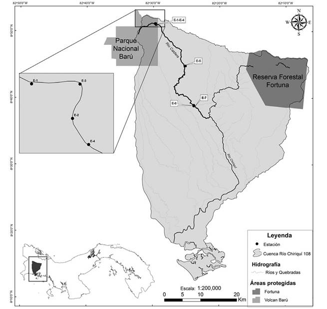 Área de estudio: Este estudio se realizó en el río Caldera ubicado en la vertiente Pacífica de Panamá, específicamente en la cuenca hidrográfica 108 (río Chiriquí) en la provincia de Chiriquí (Gonzáles & Tejada, 2009). El río Caldera nace dentro del Parque Nacional Volcán Barú (PNVB) a una altura de 3 302 msnm y cuenta con una longitud de 49.4 km. La estación seca o de menor cantidad de precipitación se prolonga desde diciembre hasta abril, mientras que la estación lluviosa inicia en mayo y se extiende hasta finales de noviembre. La precipitación promedio anual es de 3 466 mm y temperaturas promedios entre ± 16.2 °C (septiembre y octubre) y ± 22.2 °C (marzo y abril) (Arosemena, 2010). Se establecieron siete estaciones de muestreo en el río Caldera y se realizaron giras mensuales entre enero y diciembre de 2015 (Figura 1). Se ubicaron cinco estaciones en la zona alta (≥1 001 msnm) de la siguiente manera: E1 [1 882 ± 6 msnm, 8°51’08.2” N - 82°29’44.0” W, velocidad de corriente (n= 15): 0.69 ± 0.12 m/s], E2 [1 493 ± 29 msnm, 8°51’02.2” N - 82°29’38.4” W, velocidad de corriente (n= 15): 1.09 ± 0.18 m/s], E3 [1 148 ± 12 msnm, 8°51’06.9” N - 82°29’37.4” W, velocidad de corriente (n= 15): 1.03 ± 0.13 m/s], E4 [1 848 ± 8 msnm, 8°50’58.7” N - 82°29’36.2” W, velocidad de corriente (n= 15): 0.88 ± 0.10 m/s], dentro de los límites del PNVB y la E5 [1 065 ± 10 msnm, 8°44’46.97” N - 82°25’8.77” W, velocidad de corriente (n= 15): 0.61 ± 0.05 m/s] en el corregimiento de Boquete. En la zona baja (≤500 msnm) se ubicaron dos estaciones: E6 [370 ± 7 msnm., 8° 38’49.8” N - 82° 23’52.8” W, velocidad de corriente (n= 15): 0.76 ± 0.14 m/s] y E7 [360 ± 13 msnm, 8°38’55.0” N - 82°23’52.1” W, velocidad de corriente (n= 15): 0.82 ± 0.19 m/s]. No se ubicaron estaciones de muestreo en la zona media debido a su inaccesibilidad.