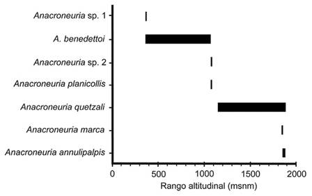 Distribución altitudinal: Las especies identificadas presentaron una distribución espacial diferenciada en dos zonas altitudinales en el río Caldera. En la zona alta: A. annulipalpis (1 848 - 1 882 msnm), A. quetzali (1 148 - 1 882 msnm), A. marca (1 848 msnm), A. benedettoi, A. planicollis y Anacroneuria sp. 2 (1 065 msnm) y en la zona baja: A. benedettoi y Anacroneuria sp. 1 (360 - 370 msnm) (Figura 2).