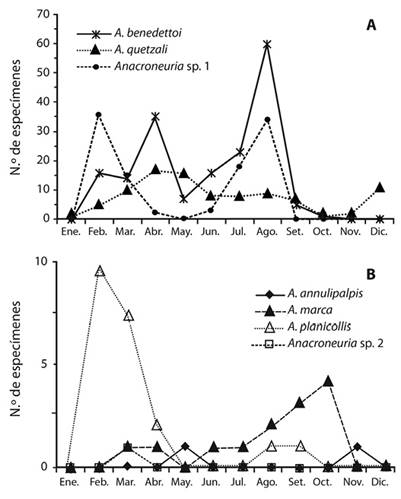 Variabilidad estacional: Con base en los muestreos mensuales realizados en las distintas estaciones del río Caldera durante el 2015, A. benedettoi, A. quetzali, A. planicollis y Anacroneuria sp. 1 presentaron un aumento gradual en el número de individuos durante la época seca en febrero y abril, de la misma manera en agosto (época lluviosa). Seguido por un descenso gradual desde mayo hasta diciembre (finales de la época lluviosa). La mayor abundancia de A. marca se dio durante la época lluviosa en octubre y mantuvo un número bajo de individuos durante la mayor parte de los meses del año. A. annulipalpis solo se recolectó en mayo (época seca) y en noviembre (época lluviosa). Anacroneuria sp. 2 solo fue recolectada en marzo (Figura 3).