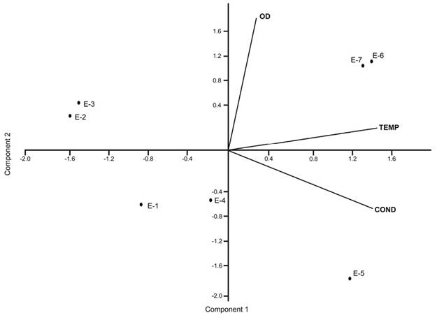 El ACP indica que la relación entre las variables ambientales puede ser explicada por los dos primeros ejes en un 93 %. El eje 1 presentó una correlación positiva con las tres variables (temperatura: 0.71, conductividad: 0.70 y OD: 0.03). El eje 2, se correlacionó positivamente con OD (0.99) y TEMP (0.02). Negativamente, se correlacionó con COND (-0.07) (Figura 4). La variabilidad por estación se correlacionó negativamente en el eje 1 para las estaciones E1, E2, E3 y E4. Positivamente, se correlacionó con las estaciones E5, E6 y E7. En el eje 2 se correlacionó positivamente con las estaciones E2, E3, E6 y E7, mientras que, las estaciones E1, E4 y E5 fueron correlacionadas negativamente. Por otro lado, el ACC indica que la correlación entre las variables físicas, químicas y biológicas puede ser explicada por los dos primeros ejes en un 68 % (Figura 5). Las variables de conductividad y temperatura estuvieron relacionadas positivamente con las especies A. benedettoi, A. planicollis, Anacroneuria sp. 1 y Anacroneuria sp. 2. Mientras que el OD estuvo relacionado negativamente con A. quetzali.