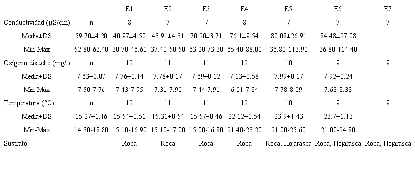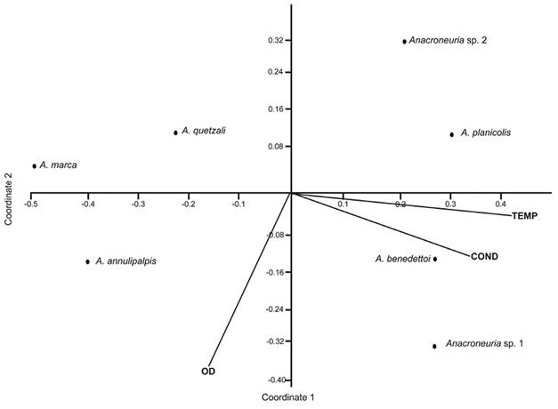 Análisis de datos físicos y químicos: Los parámetros físicos y químicos en las cuatro estaciones (E1-E4), donde fueron recolectadas las ninfas de A. annulipalpis, A. quetzali y A. marcapresentaron valores mínimos y máximos de OD (7.31 - 7.95 mg/L) y temperatura (14.3 - 18.8 °C) muy similares, mientras que la conductividad (37.4 - 73.3 µs/cm) fue más variada. Debe mencionarse que estos especímenes se recolectaron solo en sustratos rocosos (Cuadro 3). Sin embargo, en las estaciones E5-E7 se obtuvieron valores más bajos de OD (6.21 - 8.33 mg/L), y más elevados de conductividad (36.8 - 114.4 µs/cm) y temperatura (21.0 - 25.6°C) a diferencia de las estaciones E1-E4. En las estaciones E5-E7 se recolectaron ninfas de A. benedettoi, A. planicollis, Anacroneuria sp. 1 y Anacroneuria sp. 2 en sustratos de hojarasca y rocas.