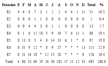 Aguirre y Bernal (2014) realizaron estudios que incluían las E6 y E7, entre diciembre de 2011 y abril 2012, donde se recolectaron alrededor de 132 ninfas entre ambos puntos. Estos resultados coinciden con este estudio en cuanto a la mayor abundancia de ninfas en estas estaciones. Este hecho puede deberse a la cobertura boscosa y estructura de la subcuenca, ya que presentan un lecho rocoso con rápidos, vegetación y hojarasca en sus orillas. Según Tomanova y Tedesco (2007), la mayor abundancia de ninfas del género Anacroneuria están concentradas en zonas de rápidos y microhábitats con hojarasca, gravilla en el lecho de la corriente y piedras, mientras que éstos pueden estar ausentes en sedimentos de arena y limo. Por otro lado, Vidal y Membiela (1993) en estudios realizados en las Sierras Segundera, Cabrera y Teleno en la Península Ibérica, informaron que los cursos pequeños de agua están constituidos mayoritariamente por plecópteros. Esta característica coincide con lo observado en este estudio en las E1, E4 y E5, que son cuerpos de agua con poca corriente y profundidad, donde se recolectó cerca de la mitad de las ninfas.
