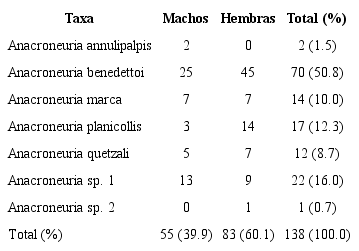 Crianza y abundancia de muestra: De las 485 ninfas recolectadas en el río Caldera, se pudieron criar en el laboratorio 138 adultos (28.4 %) y murieron 347 ninfas (71.6 %). Las mayores cantidades de ninfas se recolectaron en las estaciones de muestreo: E7 (26.4 %), seguida de E6 (22.9 %), E5 (19.0 %), E4 (18.1 %) y E1 (10.5 %). Las menores cantidades de ninfas se recolectaron en las estaciones E3 (2.7 %) y E2 (0.4 %) (Cuadro 1). Los especímenes adultos criados fueron 55 machos (39.9 %) y 83 hembras (60.1 %). De éstos, A. benedettoi fue la más abundante (50.7 %), seguida de Anacroneuria sp. 1 (16.0 %), A. planicollis (12.3 %), A. marca (10.0 %), A. quetzali (8.7 %), A. annulipalpis (1.5 %) y Anacroneuria sp. 2 (0.7 %) (Cuadro 2). Por otro lado, la emergencia de las ninfas a adultos se presentó en horas nocturnas, con una duración del proceso entre 10 a 20 minutos, entre los 2 a 49 días después de la recolecta.
