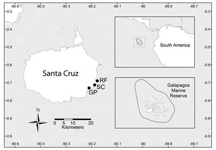 Study site: The GMR is located in the Pacific Ocean 1 000 km west from mainland Ecuador. The archipelago comprises of approximately 19 islands and 40 islets (Jackson, 1994). Marine management only allows the operation of artisanal fishing within the GMR, and in explicitly designated areas (Danulat & Edgar, 2002). The main study sites were located in the Southeastern face of Santa Cruz Island, a volcanic island located in the center of the Galapagos Archipelago. The island covers an area of 985.22 km2 and has a coastline of 184 km length (DPNG, 2014). The sea surface temperature at Santa Cruz Island has been stable but with slight increased seasonality reported during the last four decades (Wolff, 2010). Seasonal temperatures during the warm months (December to April) average at 25.1 oC, while cooler months (August-October) averaged at 21.8 oC (Wolff, 2010). Three sites located in the south-east face of the island were sampled: Punta Rocafuerte (RF; 0°39’35.15”S & 90°11’9.53”W) and Saca Calzón (SC; 0°41’5.57”S & 90°11’44.24”W), where fishing is allowed; and, Garrapatero (GP; 0°42’4.25”S & 90°13’20.74”W), where fishing is prohibited (Figure 1). The red mangrove (Rhizophora mangle) is the main plant species covering the bays across the Galapagos Archipelago (Danulat & Edgar, 2002).