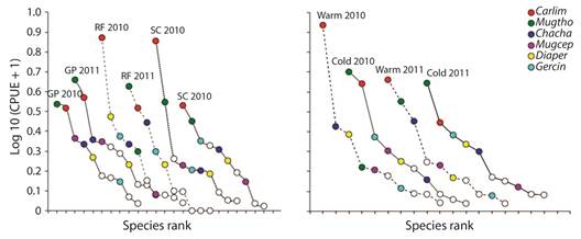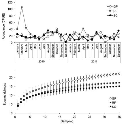 Data analysis: We standardized our fishing effort and fish abundance by estimating the catch per unit effort (CPUE) as the number of individuals caught per 300 m2 of mesh per hour. To reduce the effect of dominant over rare species in our analysis we log-transformed the CPUE (also referred as abundance). We evaluated sampling effort with a Bootstrap (10 000 randomizations) Species Richness analysis per site, following Clarke and Gorley (2006). To assess the species dominance per site and season, we calculated the actual species rank curve per year and plotted these results side by side. A species rank curve shows all the species organized in terms of the registered abundance (from high to low). A one-way Analysis of Similitude (ANOSIM) permutation test (Clarke & Green, 1988) was used to test the effect of qualitative environmental factors over the sampled fish assemblage structure. Furthermore, we used the distance-based Redundancy Analysis (db-RDA) (Legendre & Anderson, 1999) to explore the effect of the numerical quantitative variables over the fish abundance. Both ANOSIM and db-RDA analysis were calculated on the same Bray-Curtis similarity matrix. Multivariate analysis were carried out using the BiodiversityR Package (Kindt & Coe, 2005) available in the R Statistical Software (R Core Team, 2016).