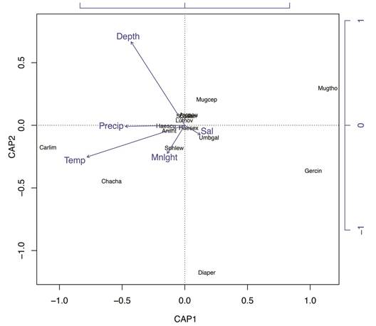 The accumulated constrained eigenvalues of the db-RDA reached up to 80 % in the first two axes, implying an adequate representation of our constrained model (Figure 4). The length of the environmental vectors of db-RDA suggests temperature and depth are major drivers of fish abundance in our study. C. limbatus and C. chanos occurred in higher abundance whenever the water temperature was higher (warmer). Differently, M. thoburni was inversely affected by water temperature, with more abundance occurring when the recorded temperature was the lowest. Salinity influenced the abundance of U. galapagorum but had little effect on the overall fish assemblage. Depth and precipitation had no positive effect in the abundance of any species, yet a weak negative effect on G. cinereus can be depicted in the ordination plot. While the effect of moonlight appears to have directly and positively influenced the abundance of Sphyrna lewini, the lack of overall captures did not show a strong correlation between these two. M. cephalus was indirectly affected by moonlight, suggesting a greater abundance of this species during or near new moon days.