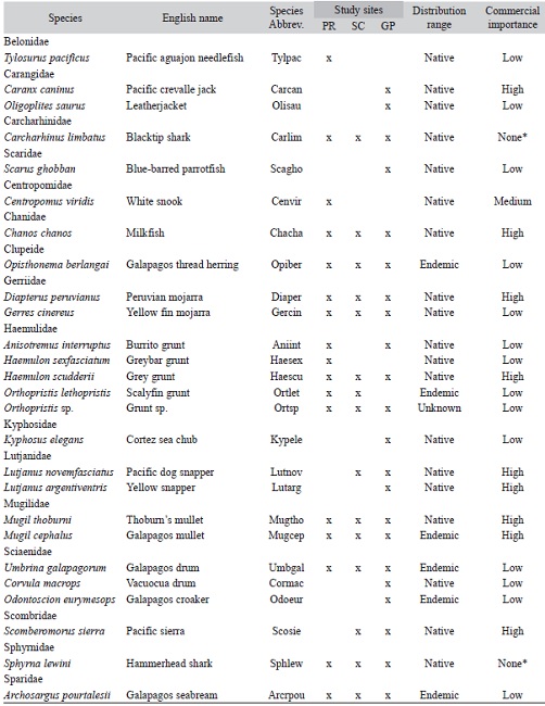 A total of 1 773 bonefish and 740 cartilaginous fish corresponding to 26 species (24 bonefish and 2 cartilaginous) and 15 families were caught over 108 fieldtrips (Table 1). Haemulidae was the best-represented family with five species (Anisotremus interruptus, Haemulon sexfasciatum, Haemulon scudderii, Orthopristis lethopristis and Orthopristis sp.). We recorded 19 native and six endemic species (Opisthonema berlangai, Mugil cephalus, Umbrina galapagorum, Orthopristis lethopristis, Odontoscion eurymesops and Archosargus pourtalesii). Individual of one species was not identified to species level (Orthopristis sp.). We caught nine species of high commercial value for the artisanal fishing sector (Haemulon scudderii, Chanos chanos, Diapterus peruvianus, Mugil thoburni, Mugil cephalus, Lutjanus novemfasciatus, Lutjanus argentiventris, Scomberomorus sierra and Carax caninus); and one species of medium commercial value (Centropumus viridis).