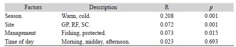 We found no significant differences in the similitude between samplings of any of the assessed factors (Table 2). Although the degrees of correlation were rather weak (R= 0.08-0.02), we found significant differences in the fish assemblage between seasons and sites (p < 0.01). Management and time of the day did not yield any significant differences between samples (p > 0.05).