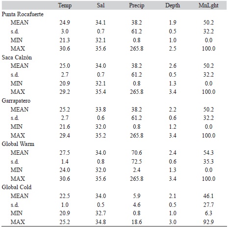 Environmental variables showed certain level of variation between sites and seasons, yet differences were not always significant (Table 3). Sea temperature was remarkably similar between the three study sites (mean range 24.9-25.2 o C; t-test p > 0.54), yet it was only significantly different between the cold (mean 22.5 o C) and the warm (mean 27.5 o C) seasons (t-test p < 0.001). Higher salinity concentration values were recorded at Punta Rocafuerte (RF, 34.1 ppt) and during the warm season (max 35.6 ppt), yet there were no significant differences between both sites and seasons (t-test p > 0.09). Sampling depth varied between 1 to 3.4 m, and it was the only variable that significantly differed between both sites and seasons (t-test p < 0.04). The collection nature of both precipitation and moonlight only allowed seasonal comparisons, which resulted in significant differences for the former (t-test p < 0.001), yet not significant for the latter (t-test p= 0.528).