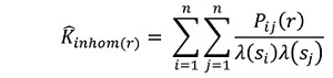 Where: = inhomogeneous K-function; indicator function; λ = first-order intensity of the events and ; and r = distance vector.