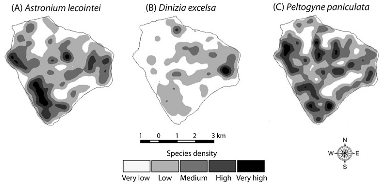 A strong positive correlation was obtained between density maps of the species Astronium lecointei and Peltogyne paniculata (0.762), indicating the overlap of their habitats. On the other hand, Dinizia excelsa species showed a weak correlation with Astronium lecointei (0.321) and Peltogyne paniculata (0.385), suggesting a separation between habitats of these species or distinct preferences by environmental conditions.