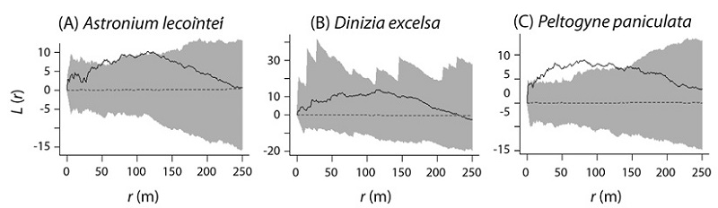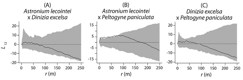Although not significant, the negative interactions of Dinizia excelsa with the other species may evidence the existence of local factors that cause spatial repulsion, such as competition (Connell, 1983; Ewel & Hiremath, 2005; Volkov et al., 2009). Cited among the Amazon tree species with higher biomass production (Guillaumet, 1987; Oliveira & Mori, 1999), Dinizia excelsa has a high growth rate (Mesquita et al., 2007) and a large crown that can shade large areas. Astronium lecointei and Peltogyne paniculata need shade in the early stages of life, with an increased need for light throughout their development (Ferraz et al., 2004; Rivera-Martín et al., 2013). These characteristics contribute to the repulsion generated by Dinizia excelsa, which, because of its dense and sparse crown, has an advantage in the competition for light and space, mainly with smaller light-demanding species.