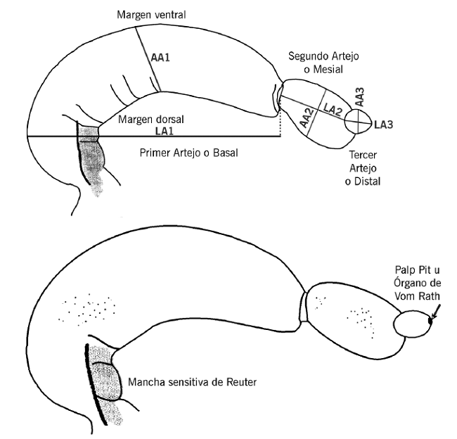 La forma de los artejos basal y mesial, observados sin escamas, guardan diferentes proporciones de largo-ancho en los dos sexos. El macho tiene una anchura mayor (tomada en la parte media) y el primer cuarto basal del primer artejo se aprecia muy abultado. Ambos sexos muestran el artejo basal reni o faseoliforme, pero más alargado y arqueado en los machos. En cuanto al grosor de cada artejo se aprecian diferencias en toda su longitud: en el macho es más angosto que en la hembra. Una medida aproximada del grosor es: en machos < 200 μm y en hembras 250 μm.