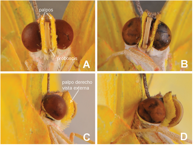 Disección y Fotografía: Se diseccionaron los palpos labiales de seis ejemplares (cuatro ♂♂ y dos ♀♀, todos en el Museo de Zoología, Facultad de Ciencias, UNAM, con los siguientes datos: MÉXICO. Oaxaca: Puente Chipehua, Santo Domingo Tehuantepec, 1♂ MZFC- LEP 372544, 31/07/2012, A. Luis, Bosque Tropical Caducifolio (BTC), 50 m. Oaxaca: Parque Nacional Huatulco, Santa María Huatulco, 100 m, BTC: 1♂ MZFC- LEP 375257, 16/03/2013, J. L. Salinas; 1 ♀ MZFC- LEP 373756, 22/10/2012, A. Arellano; 1 ♀ MZFC- LEP 375253, 16/03/2013, J. Llorente. Michoacán: Rancho Nuevo, Arteaga, MZFC- LEP sin/números, 1♂ 31/05/1998, 1♂ 19/01/1998) que pasaron en humefacción en una cámara o recipiente con papel absorbente y agua. La disección se efectuó bajo un microscopio estereoscópico Olympus SZX9 a 20x de magnificación; se desprendió primero la cabeza, por medio de pinzas finas Rubis Switzerland 5-SA y después la proboscis; luego se procedió a retirar los palpos ayudados con una jeringa de insulina (BD Ultra-fine U-100 0,3 mL, 31G X 6mm), a manera de aguja de disección fina y un pincel miniatura Rodin M27 como instrumento de sujeción. Los palpos se almacenaron en seco dentro de microviales rotulados con su clave de identificación en la tapa. Se eligió un ejemplar de cada sexo para limpiar sus palpos derechos; para lo cual se colocó cada palpo en una caja de Petri PYREX de 10 cm y se eliminaron las escamas en alcohol al 50 % por medio de pinzas Dumont Dumostarl (0209-4-PO, Style 4), cambiando varias veces el alcohol hasta donde fue posible quitar la mayoría de ellas. En ocasiones el palpo también se lavó con agua destilada y se sumergió en hipoclorito de sodio al 50 % durante 2-3 min, observándose bajo el microscopio hasta aclararse las escamas que no se pudieron retirar con las pinzas más finas. Nuevamente se lavaron y se fotografiaron sumergiendo el palpo limpio en alcohol en gel, para evitar el movimiento durante las tomas. Se efectuaron medidas con el ocular micrométrico calibrado del microscopio; los palpos sin escamas se fotografiaron con la cámara Olympus DP12 integrada a un microscopio SZX12, con el objeto de efectuar el esquema. Los palpos sin escamas se conservaron en microviales de tapa plana de 0.2 ml, en alcohol al 70 %, rotulados con su clave en la tapa. Las fotografías de la cabeza y palpos se tomaron en una cámara Nikon D700, con lente AF-S Micro Nikkor 105 mm.