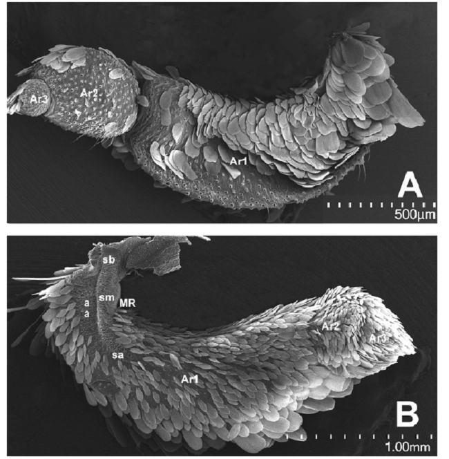 Artejo mesial. Mide 0.5 mm de longitud (LA2), con ancho (AA2) de 0.35 mm. En su vista externa exhibe 5 a 6 hileras de sensilas. Cada una consta de cuatro a cinco sensilas quéticas T1 intercaladas con escamas (Figura 6A). En su vista interna se aprecia la superficie cóncava y en forma de cuchara.